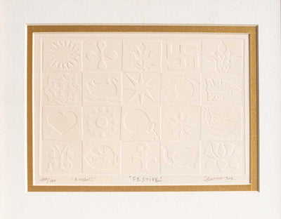 Embossed collection of Indian celebratory symbols with a cream mount. Editioned and signed. Ideal for gifting!